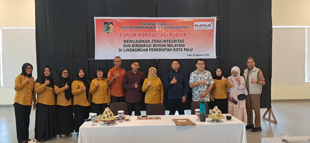 Dalam upaya memperkuat komitmen terhadap reformasi birokrasi serta mendorong terciptanya tata kelola pemerintahan yang bersih, akuntabel, dan bebas dari korupsi, Dinas Penanaman Modal dan Pelayanan Terpadu Satu Pintu (DPMPTSP) Kota Palu menggelar Forum Konsultasi Publik bertema “Mewujudkan Zona Integritas dan Birokrasi Resmi Melayani”, pada Selasa (12/08/2025) di Aula Restoran Kampung Nelayan Kota Palu.